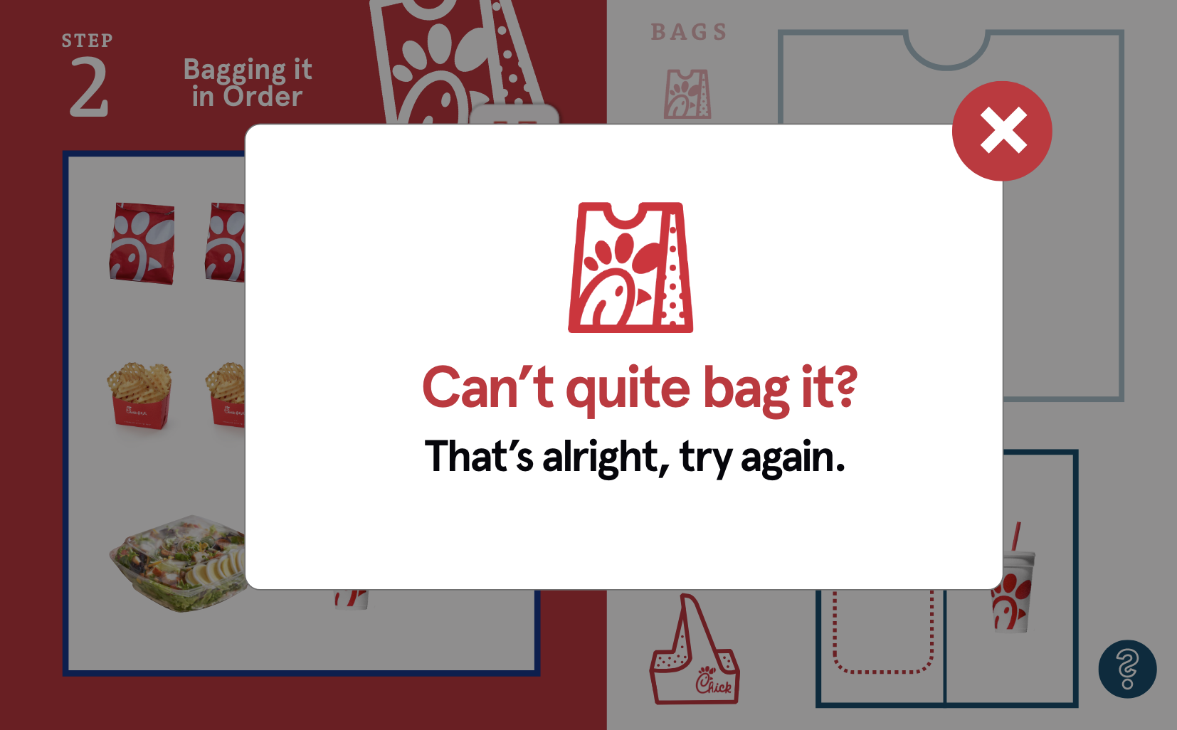 This module involved a three step system that would cover the required cutlery, the particular order in which items had to be placed in the various available bag sizes and the various sauces and dressing included with specific menu items.