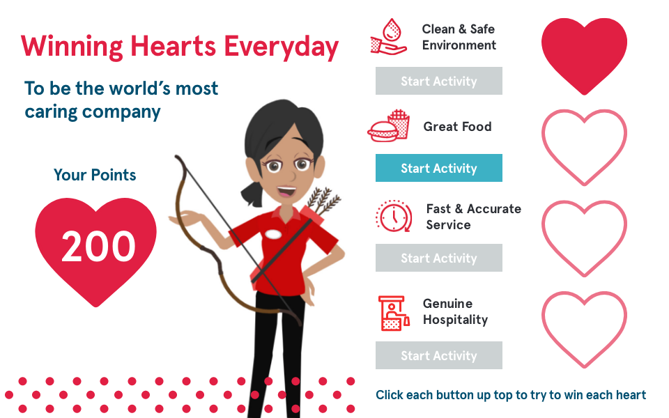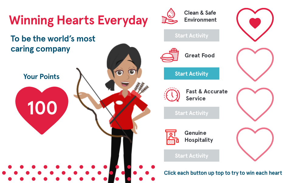 Chick-fil-A hospitality is founded on 4 foundational pillars. The Winning Hearts Everyday Module gives employees clear examples of how to practice each of the foundational pillars and gives them gamified scenarios where they can practice appropriate responses.